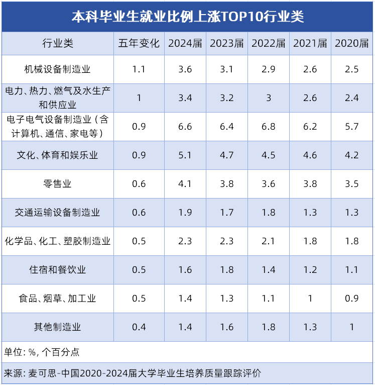 对于面对升学选择的高中生而言,专业的挑选关乎将来的职业成长轨迹。领会当下及将来的就业趋向,成长潜力凸起的行业,能让专业选择更具前瞻性。近五年,成为吸纳结业生的主要阵地。接下来小优将为你细致解读就业比例上涨TOP10行业类,找准适配的专业标的目的,为你的升学规划供给参考。 这10个行业类的分布特征明显:制制业相关行业占领从导,涵盖机械设备、电子电气设备等多个细分范畴,占TOP10中的6席。这一态势表现了我国制制业转型升级成效,高端配备制制、电子消息等焦点范畴对专业本科人才需求兴旺。同时,能源保障、消费升级、平易近生办事等类行业的稳步增加,也为大师将来职业选择供给了更多元标的目的,这些增加显著行业对应的专业范畴,值得沉点关心。机械设备制制业是支持国平易近经济成长的主要根本财产,当前正加快向高端化、智能化、绿色化转型,笼盖工业出产、根本设备扶植等多个环节范畴,高端配备制制、细密仪器研发等标的目的对本科手艺人才的需求持续攀升。该专业是机械类的保守王牌专业,焦点是培育控制机械设想、制制工艺和从动化节制等分析能力的手艺人才。学生将进修若何设想合适需求的机械产物,优化出产工艺流程,处理出产中的手艺难题,具备从产物研发到出产落地的全流程参取能力。报考需具备结实数学、物理根本,力学学问尤为环节。升入大学后需注沉实践,积极参取尝试、工业练习取学科竞赛,考取CAD工程师认证提拔合作力。就业面广,可入职汽车制制、工程机械、航空航天等企业,处置机械设想、工艺、设备办理等岗亭,需留意部门岗亭需驻厂或深切车间,工做相对艰辛,做息需贴合出产节拍,报考前可提前领会。 做为一门融合机械工程、从动化手艺、计较机科学的交叉学科,智能制制工程专业,聚焦于数字化工场扶植和智能配备研发,旨正在培育可以或许使用先辈手艺对保守出产模式进行升级主要根本财产,渗入于出产糊口各范畴。近年来正在精细化工财产沉点搀扶、新材料手艺立异鞭策下,行业正向高端化、新材料研发、保守产物升级等需求,为本科手艺人才供给了不变且有潜力的就业平台。 该专业是化工行业的焦点专业,培育控制化学工程道理、化工工艺设想、化学反映工程、化工设备等学问的手艺人才,学生将具备化工出产流程设想、工艺优化、产质量量节制、化工设备研发等分析能力,是支持行业出产和手艺升级的焦点人才。报考需结实化学、数学根本,沉点控制无机化学、无机化学学问。大学进修中注沉尝试取练习,参取化工出产练习、工艺设想项目堆集经验,树立绿色化工取平安出产。就业可入职中石化、中石油等大型化工企业,新材料企业,处置工艺工程师、出产手艺办理、产物研发等岗亭,也可进入环保部分担任化工废水、废气处置,职业笼盖面广,不变性强。